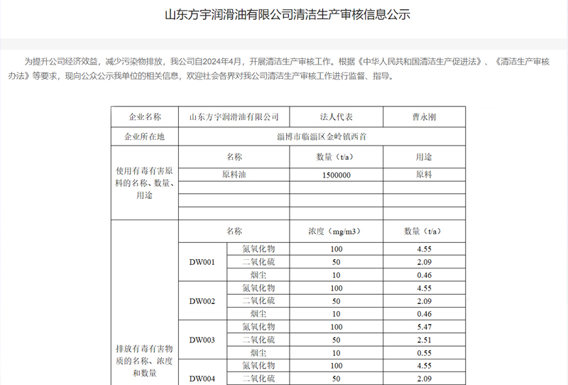 山東方宇潤滑油有限公司清潔生產(chǎn)審核信息公示